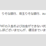 即PATはシステム障害により、三菱UFJ銀行・ゆうちょ銀行・りそな銀行・埼玉りそな銀行・auじぶん銀行利用者は入出金ができない状況。 https://t.co/q3QGQNjiXA